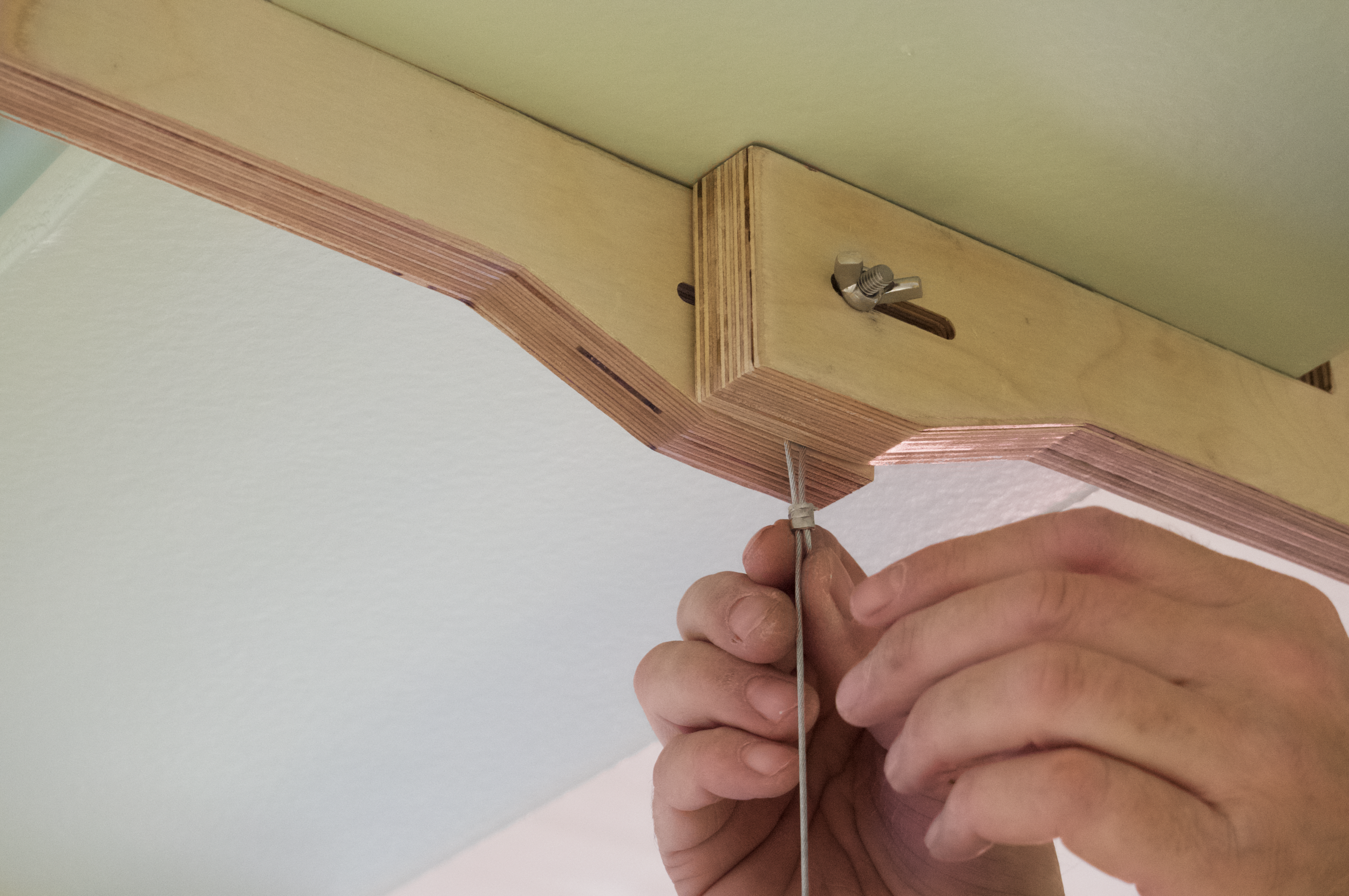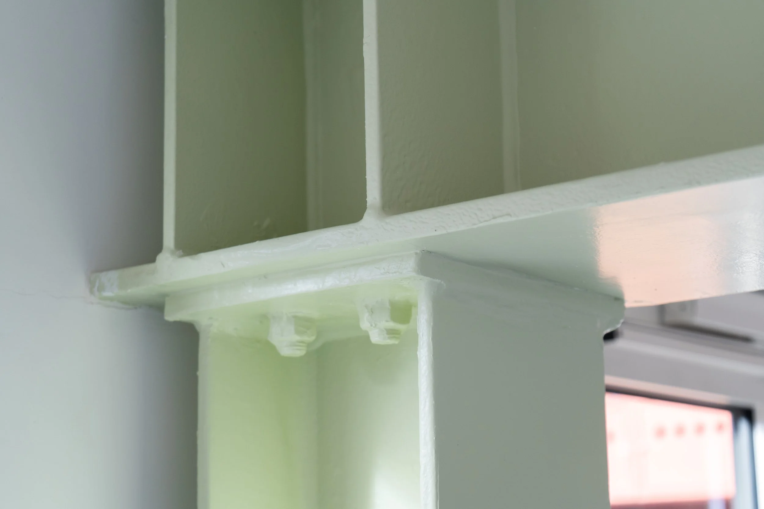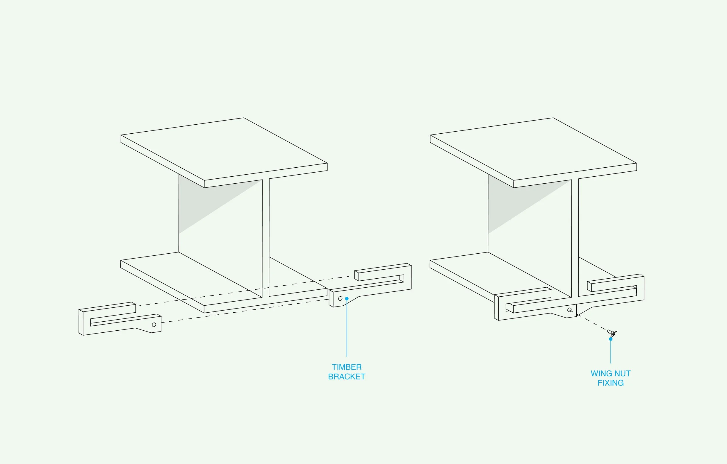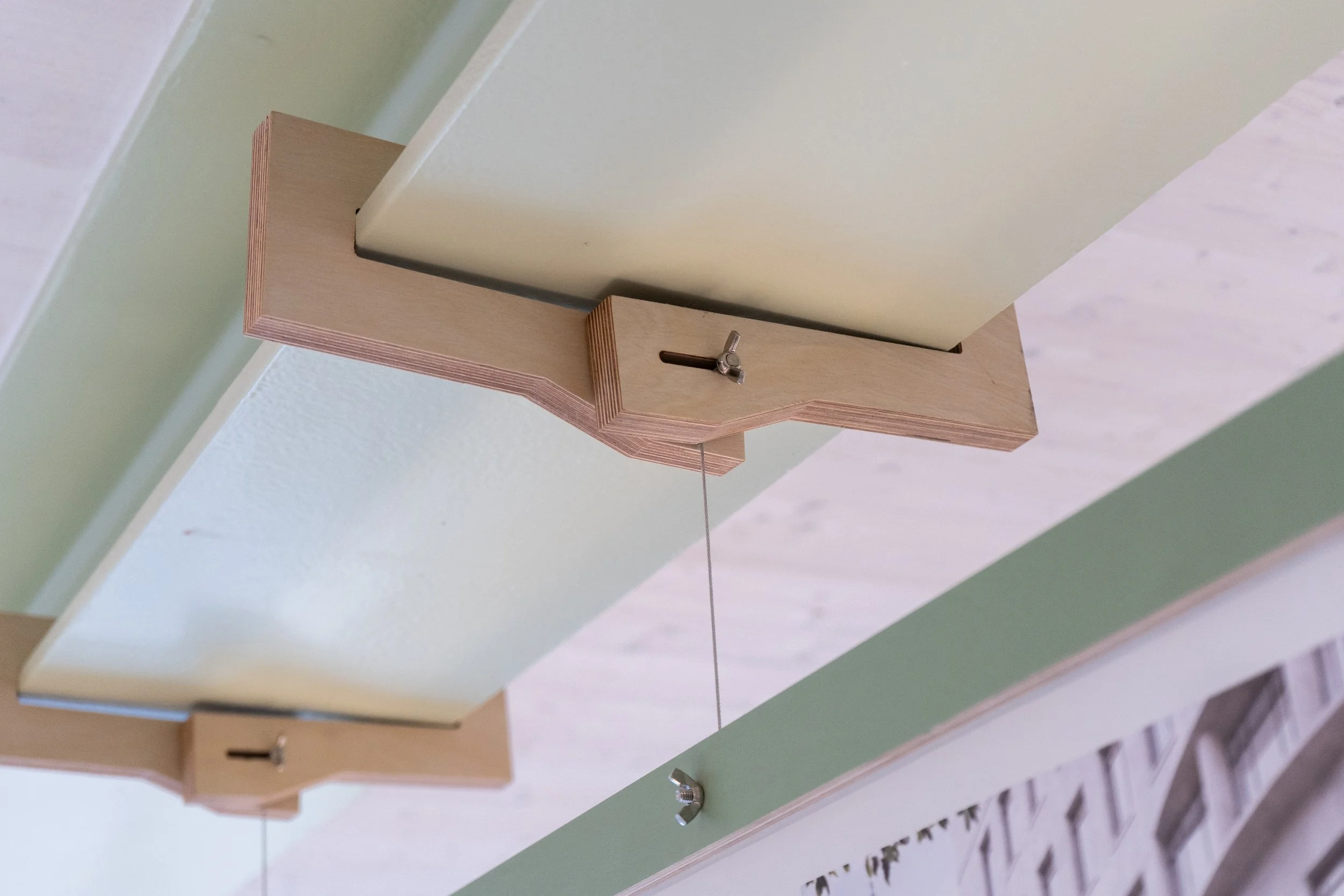 A bespoke hanging mechanism was created to work with the buildings explosed structure, neatly and unintrusively grasping the structure, giving the foundations to hang upon.