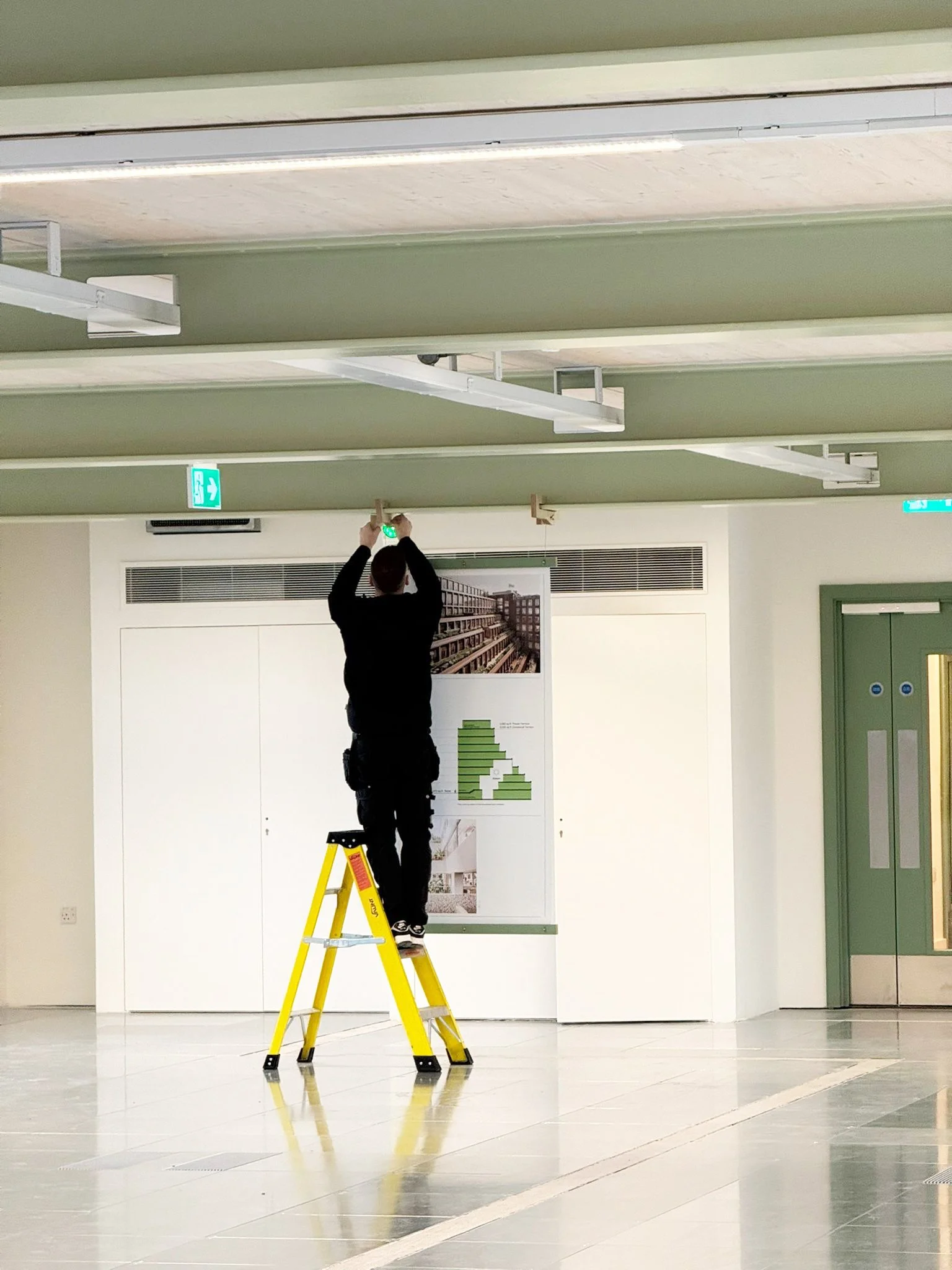 To ensure the installation felt integral rather than applied, we engineered a bespoke hanging mechanism that interfaces directly with the exposed structural frame. This allows the graphics to sit elegantly and unobtrusively within the space, grounded in the architecture itself.